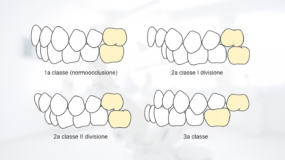 Per classificare i diversi tipi di occlusione, l’odontoiatria utilizza tre principali categorie, definite classi dento-scheletriche. Queste dipendono dal posizionamento dei primi molari e dalla relazione tra mascella (arcata superiore) e mandibola (arcata inferiore).